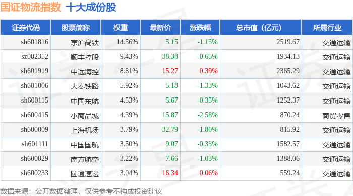 国证物流(399353)指数十大成份股详情如下: