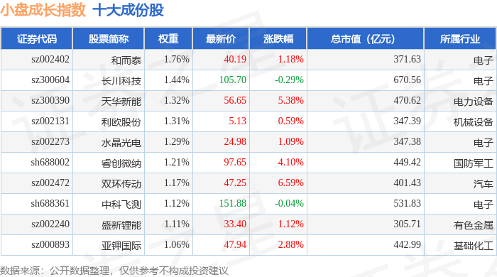 小盘成长(399376)指数十大成份股详情如下: