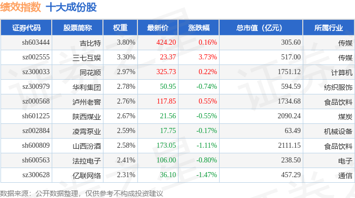 绩效指数(399398)十大成份股详情如下: