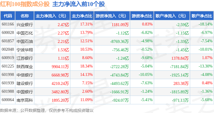资金流向方面,红利100(399411)指数成份股当日主力资金净流出合计15.52亿元,游资资金净流入合计6.65亿元,散户资金净流入合计8.86亿元。成份股资金流向详情见下表: