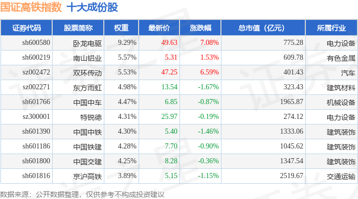 国证高铁(399419)指数十大成份股详情如下: