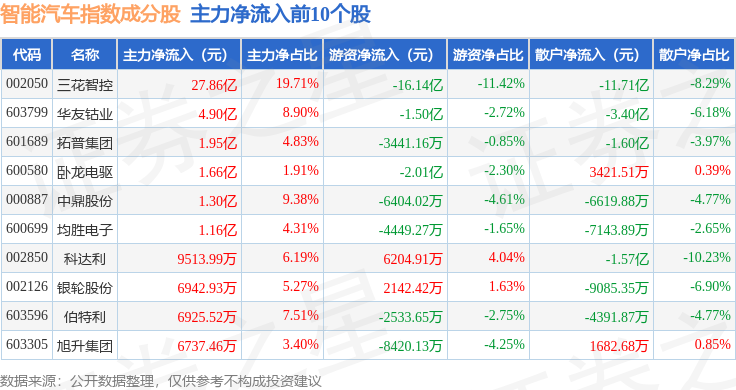 资金流向方面,智能汽车(399432)指数成份股当日主力资金净流入合计24.09亿元,游资资金净流出合计19.33亿元,散户资金净流出合计4.77亿元。成份股资金流向详情见下表: