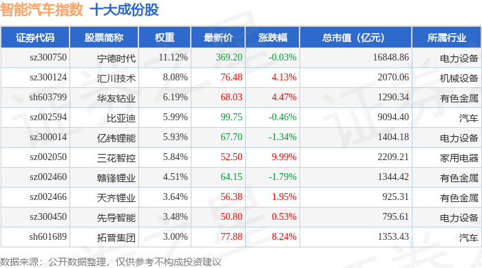 证券之星消息,12月30日,智能汽车(399432)指数报收于6820.37点,涨2.08%,成交967.25亿元,换手率3.41%。当日该指数成份股中,上涨的有36家,三花智控以9.99%的涨幅领涨,下跌的有14家,联创电子以1.94%的跌幅领跌。