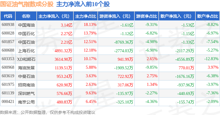 资金流向方面,国证油气(399439)指数成份股当日主力资金净流入合计2.27亿元,游资资金净流出合计2.54亿元,散户资金净流入合计2674.5万元。成份股资金流向详情见下表: