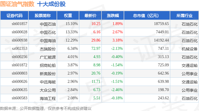 国证油气(399439)指数十大成份股详情如下: