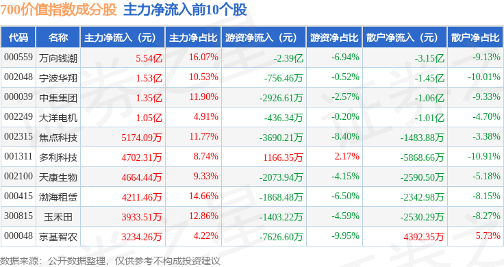 资金流向方面,700价值(399629)指数成份股当日主力资金净流出合计7386.3万元,游资资金净流出合计1.24亿元,散户资金净流入合计1.98亿元。成份股资金流向详情见下表: