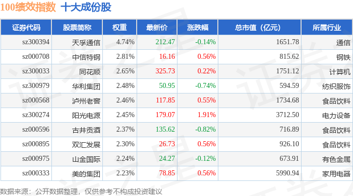 100绩效(399656)指数十大成份股详情如下:
