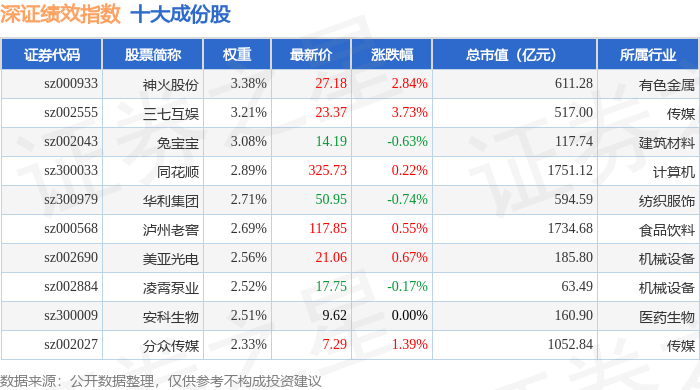 证券之星消息,12月30日,深证绩效(399655)指数报收于10806.32点,涨0.28%,成交758.46亿元,换手率1.33%。当日该指数成份股中,上涨的有46家,三花智控以9.99%的涨幅领涨,下跌的有51家,国光股份以5.59%的跌幅领跌。