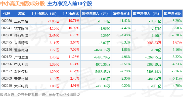 资金流向方面,中小高贝(399664)指数成份股当日主力资金净流入合计2.37亿元,游资资金净流出合计17.52亿元,散户资金净流入合计15.15亿元。成份股资金流向详情见下表: