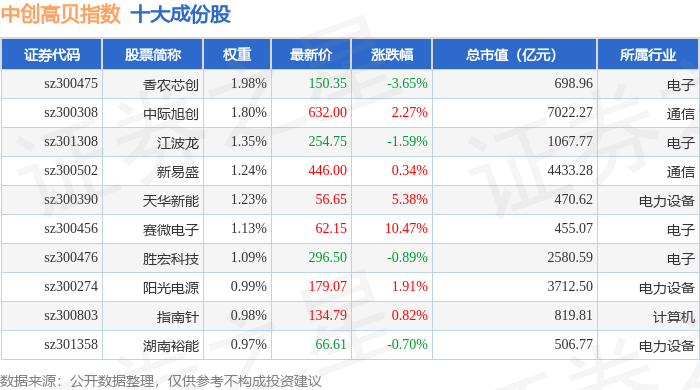 中创高贝(399666)指数十大成份股详情如下:
