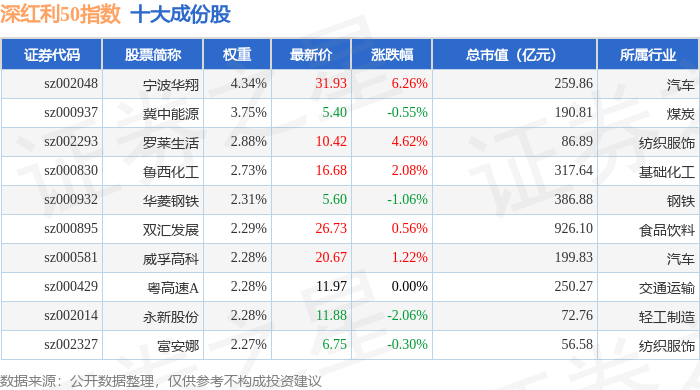 证券之星消息,12月30日,深红利50(399672)指数报收于4122.75点,涨0.5%,成交113.91亿元,换手率1.04%。当日该指数成份股中,上涨的有25家,宁波华翔以6.26%的涨幅领涨,下跌的有21家,华明装备以3.29%的跌幅领跌。