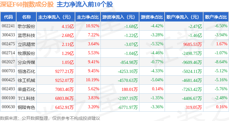 资金流向方面,深证F60(399701)指数成份股当日主力资金净流出合计4.98亿元,游资资金净流出合计4.92亿元,散户资金净流入合计9.9亿元。成份股资金流向详情见下表: