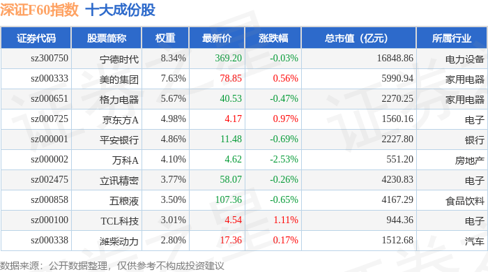 证券之星消息,12月30日,深证F60(399701)指数报收于7965.73点,涨0.33%,成交722.74亿元,换手率0.97%。当日该指数成份股中,上涨的有29家,恒逸石化以10.02%的涨幅领涨,下跌的有29家,万科A以2.53%的跌幅领跌。