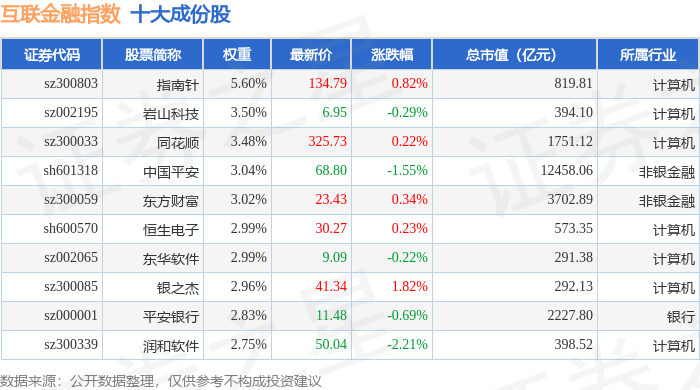 证券之星消息,12月30日,互联金融(399805)指数报收于3831.78点,涨0.14%,成交642.78亿元,换手率1.7%。当日该指数成份股中,上涨的有31家,航天信息以9.96%的涨幅领涨,下跌的有30家,恒宝股份以4.15%的跌幅领跌。