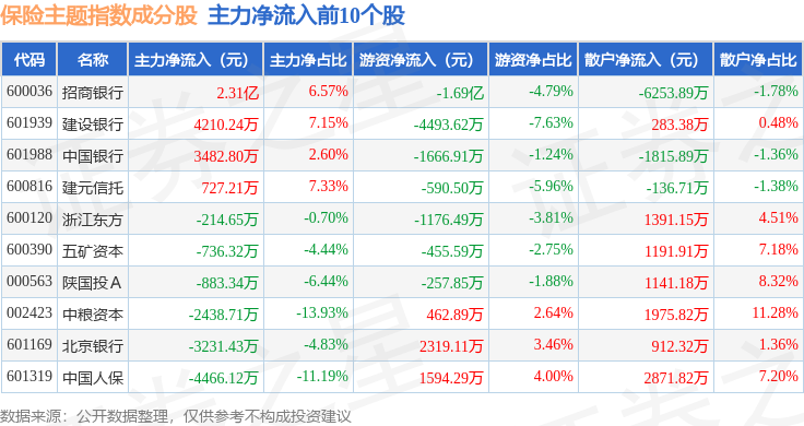 资金流向方面,保险主题(399809)指数成份股当日主力资金净流出合计16.34亿元,游资资金净流入合计1.4亿元,散户资金净流入合计14.94亿元。成份股资金流向详情见下表:
