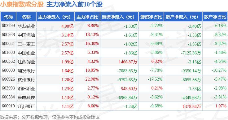 资金流向方面,小康指数(399901)成份股当日主力资金净流出合计12.14亿元,游资资金净流入合计5.84亿元,散户资金净流入合计6.31亿元。成份股资金流向详情见下表: