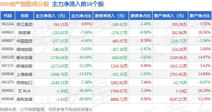 资金流向方面,800地产(399965)指数成份股当日主力资金净流出合计5.25亿元,游资资金净流入合计9452.87万元,散户资金净流入合计4.31亿元。成份股资金流向详情见下表: