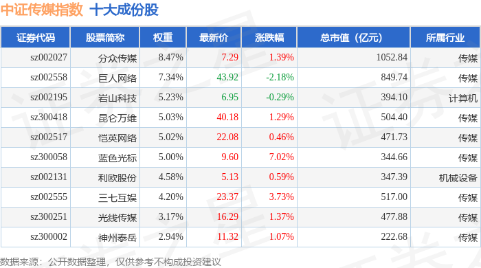 证券之星消息,12月30日,中证传媒(399971)指数报收于1436.93点,涨0.72%,成交365.53亿元,换手率3.1%。当日该指数成份股中,上涨的有34家,蓝色光标以7.02%的涨幅领涨,下跌的有14家,电广传媒以10.0%的跌幅领跌。