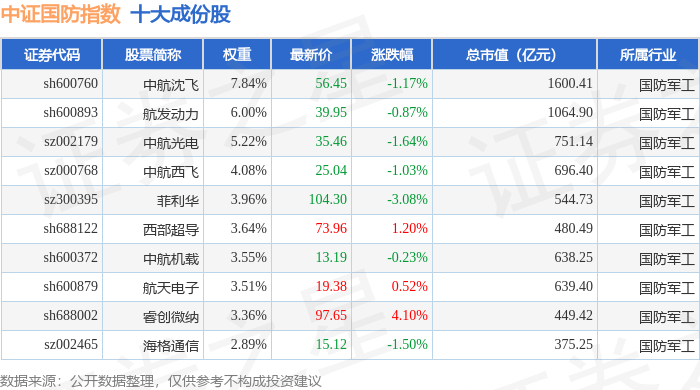 证券之星消息,12月30日,中证国防(399973)指数报收于1825.52点,跌0.58%,成交784.55亿元,换手率5.09%。当日该指数成份股中,上涨的有19家,睿创微纳以4.1%的涨幅领涨,下跌的有31家,臻镭科技以5.57%的跌幅领跌。