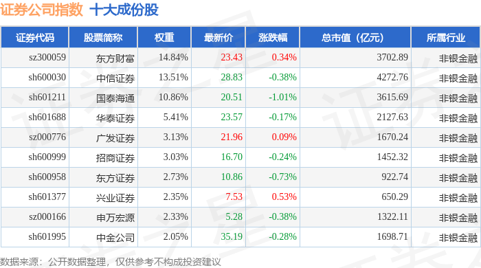 证券之星消息,12月30日,证券公司(399975)指数报收于856.73点,跌0.23%,成交260.05亿元,换手率0.76%。当日该指数成份股中,上涨的有14家,华林证券以3.61%的涨幅领涨,下跌的有30家,红塔证券以1.44%的跌幅领跌。