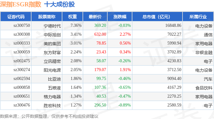 证券之星消息,12月30日,深指ESGR(470026)指数报收于19459.76点,涨0.56%,成交4633.49亿元,换手率1.77%。当日该指数成份股中,上涨的有179家,赛微电子以10.47%的涨幅领涨,下跌的有202家,惠城环保以9.01%的跌幅领跌。