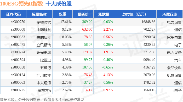 100ESG领先R(470030)指数十大成份股详情如下: