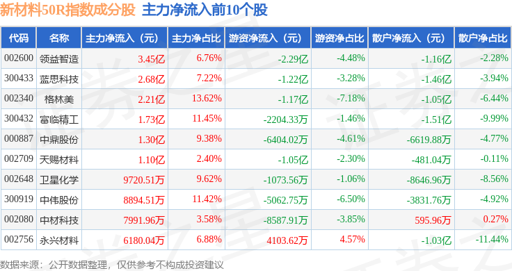 资金流向方面,新材料50R(470042)指数成份股当日主力资金净流出合计16.7亿元,游资资金净流出合计3.11亿元,散户资金净流入合计19.82亿元。成份股资金流向详情见下表: