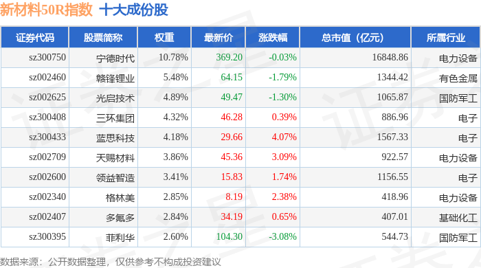 新材料50R(470042)指数十大成份股详情如下: