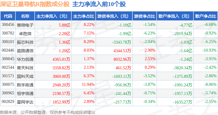 资金流向方面,深证卫星导航R(470050)指数成份股当日主力资金净流出合计39.73亿元,游资资金净流入合计8.73亿元,散户资金净流入合计31.0亿元。成份股资金流向详情见下表: