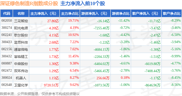 资金流向方面,深证绿色制造R(470069)指数成份股当日主力资金净流出合计21.12亿元,游资资金净流出合计6.82亿元,散户资金净流入合计27.94亿元。成份股资金流向详情见下表: