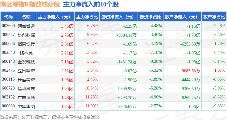 资金流向方面,湾区综指R(480003)指数成份股当日主力资金净流出合计68.48亿元,游资资金净流入合计10.28亿元,散户资金净流入合计58.06亿元。成份股资金流向详情见下表: