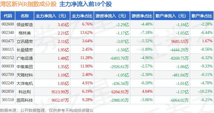 资金流向方面,湾区新兴R(480007)指数成份股当日主力资金净流出合计34.21亿元,游资资金净流入合计3.26亿元,散户资金净流入合计30.95亿元。成份股资金流向详情见下表: