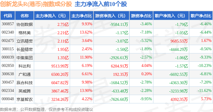 资金流向方面,创新龙头R(港币)(480037)指数成份股当日主力资金净流出合计23.5亿元,游资资金净流入合计2033.53万元,散户资金净流入合计23.3亿元。成份股资金流向详情见下表: