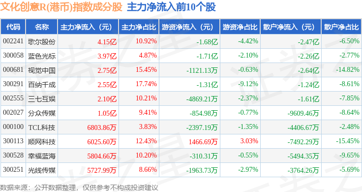 资金流向方面,文化创意R(港币)(480047)指数成份股当日主力资金净流入合计16.71亿元,游资资金净流出合计4.86亿元,散户资金净流出合计11.85亿元。成份股资金流向详情见下表: