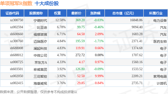 证券之星消息,12月30日,单项冠军R(480150)指数报收于10490.89点,涨0.8%,成交1159.5亿元,换手率1.92%。当日该指数成份股中,上涨的有31家,三花智控以9.99%的涨幅领涨,下跌的有18家,金风科技以6.74%的跌幅领跌。