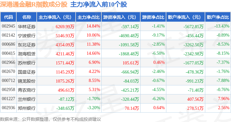 资金流向方面,深港通金融R(483025)指数成份股当日主力资金净流出合计8.45亿元,游资资金净流入合计2.36亿元,散户资金净流入合计6.09亿元。成份股资金流向详情见下表: