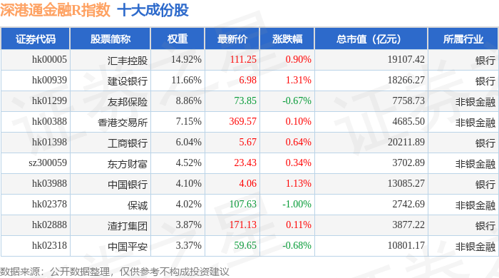 深港通金融R(483025)指数十大成份股详情如下: