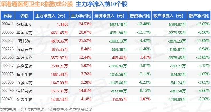 资金流向方面,深港通医药卫生R(483023)指数成份股当日主力资金净流出合计15.48亿元,游资资金净流出合计2.02亿元,散户资金净流入合计17.49亿元。成份股资金流向详情见下表: