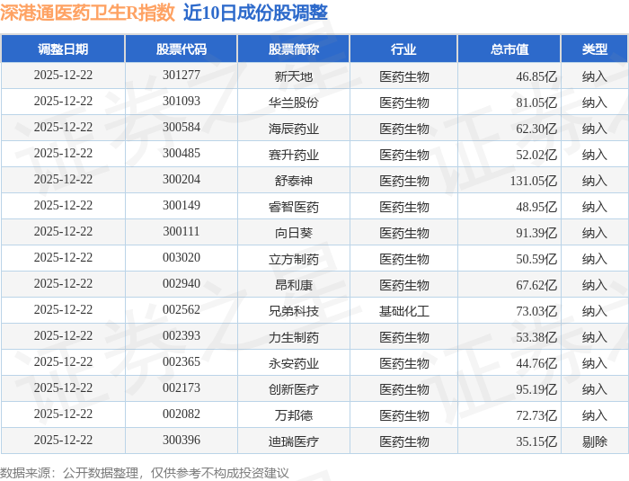 近10日内深港通医药卫生R(483023)指数成份股做了调整,新纳入了14只股票,剔除了1只股票。