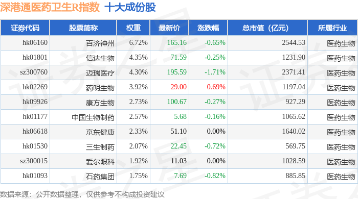 深港通医药卫生R(483023)指数十大成份股详情如下: