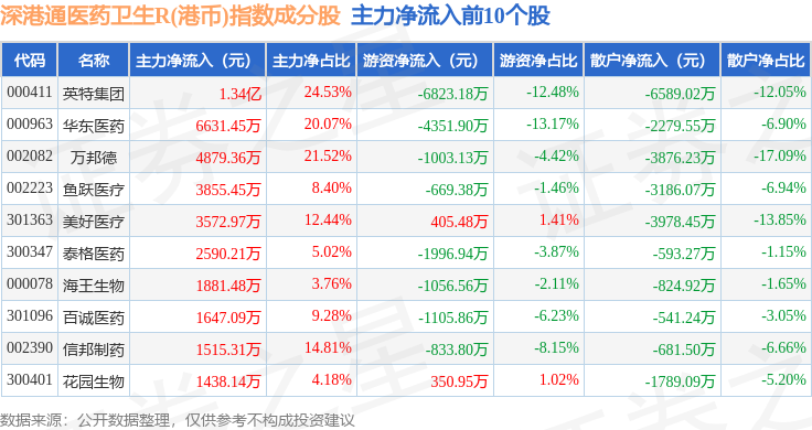 资金流向方面,深港通医药卫生R(港币)(483024)指数成份股当日主力资金净流出合计15.48亿元,游资资金净流出合计2.02亿元,散户资金净流入合计17.49亿元。成份股资金流向详情见下表: