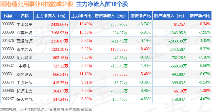资金流向方面,深港通公用事业R(483031)指数成份股当日主力资金净流出合计3.2亿元,游资资金净流入合计2354.39万元,散户资金净流入合计2.97亿元。成份股资金流向详情见下表: