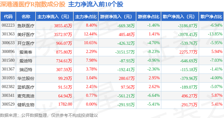 资金流向方面,深港通医疗R(483035)指数成份股当日主力资金净流出合计3.9亿元,游资资金净流出合计1.07亿元,散户资金净流入合计4.97亿元。成份股资金流向详情见下表: