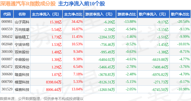 资金流向方面,深港通汽车R(483039)指数成份股当日主力资金净流入合计25.05亿元,游资资金净流出合计7.39亿元,散户资金净流出合计17.66亿元。成份股资金流向详情见下表: