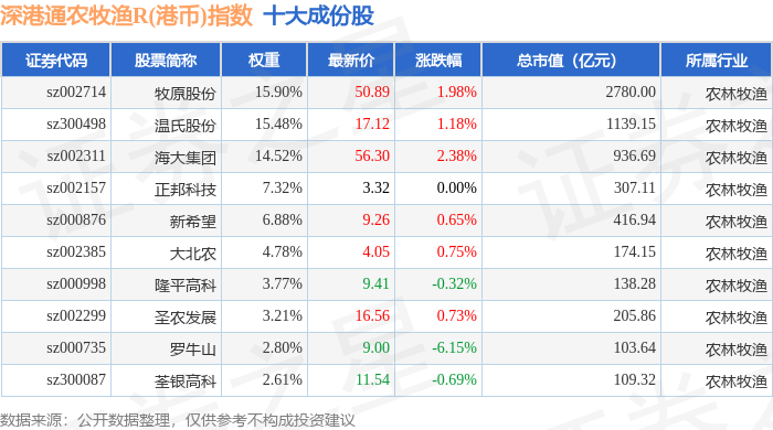 深港通农牧渔R(港币)(483052)指数十大成份股详情如下: