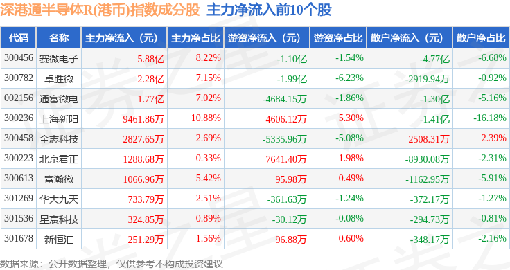 资金流向方面,深港通半导体R(港币)(483068)指数成份股当日主力资金净流入合计1.32亿元,游资资金净流出合计1.1亿元,散户资金净流出合计2210.59万元。成份股资金流向详情见下表: