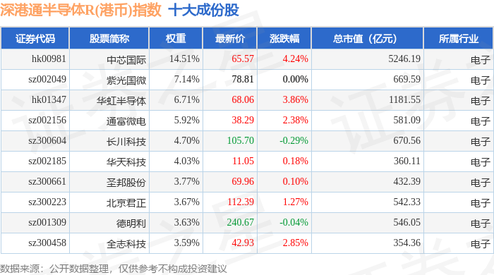 深港通半导体R(港币)(483068)指数十大成份股详情如下: