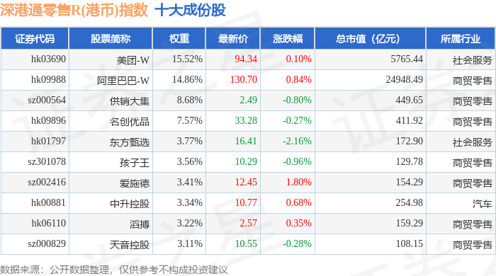 深港通零售R(港币)(483074)指数十大成份股详情如下: