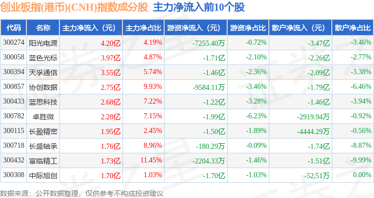 资金流向方面,创业板指(港币)(CNH)(970006)指数成份股当日主力资金净流出合计30.43亿元,游资资金净流出合计5763.96万元,散户资金净流入合计31.01亿元。成份股资金流向详情见下表: