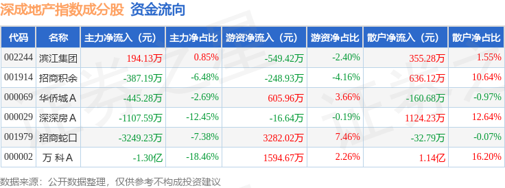 资金流向方面,深成地产(971001)指数成份股当日主力资金净流出合计1.8亿元,游资资金净流入合计4667.67万元,散户资金净流入合计1.34亿元。成份股资金流向详情见下表: